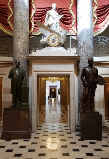 SOUNDS OF SILENCE. With the House on what seems like a permanent GOP vacation, and no public tours being conducted, there isn’t much happening inside the Capitol. From here in Statuary Hall, Clio the Muse of History, has little to write about these days. There wasn’t anyone around from here on the House side, through the Rotunda, and over to the Old Senate Chamber.