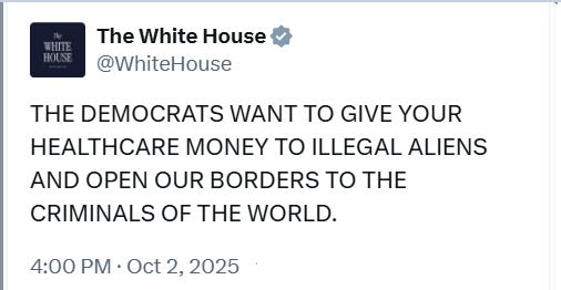 This government shutdown is the result of hardball politics driven by the demands far-left groups are making for Democratic Party leaders to put on a show of their opposition to President Trump. The shutdown is hurting Americans and our economy, and the irony is it has only handed more power to the president. This fight is ostensibly about health care, so let me be clear: I opposed the GOP’s Medicaid cuts and I want to extend the ACA tax credits. But some of my colleagues in the majority party have reasonable concerns about tax credits going to high-income households. There’s room and time to negotiate. But normal policy disagreements are no reason to subject our constituents to the continued harm of this shutdown.
