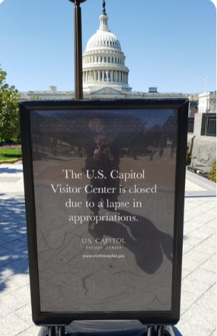 MESSAGE. “The U.S. Capitol Visitor Center is closed due to a lapse in appropriations,” the sign says. You might be able to spot the reflection of your intrepid reporter in the photo above.