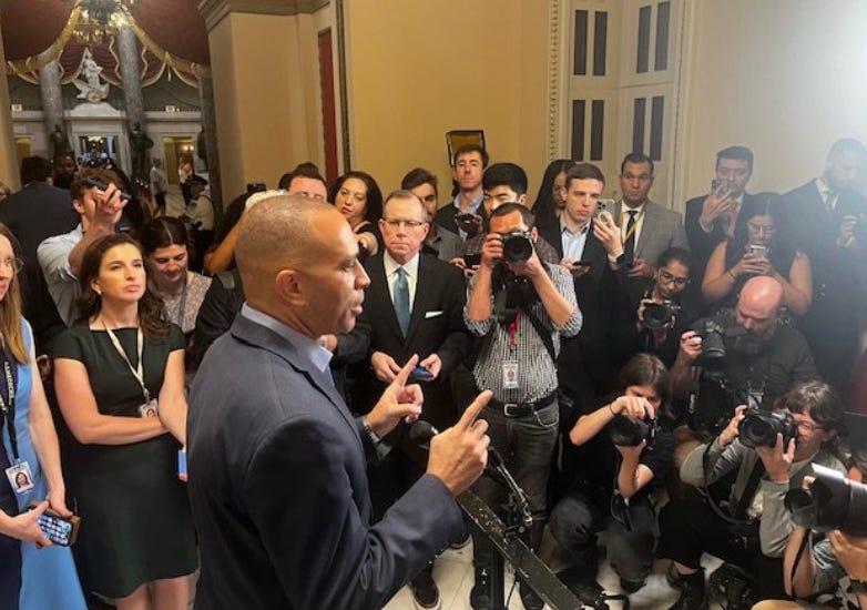 JEFFRIES. “We are here today in the Capitol, ready to get to work,” House Democratic Leader Hakeem Jeffries told a group of reporters on Wednesday just off the House floor. “We need leadership that brings people together, not national leadership that tears people apart,” Jeffries added.