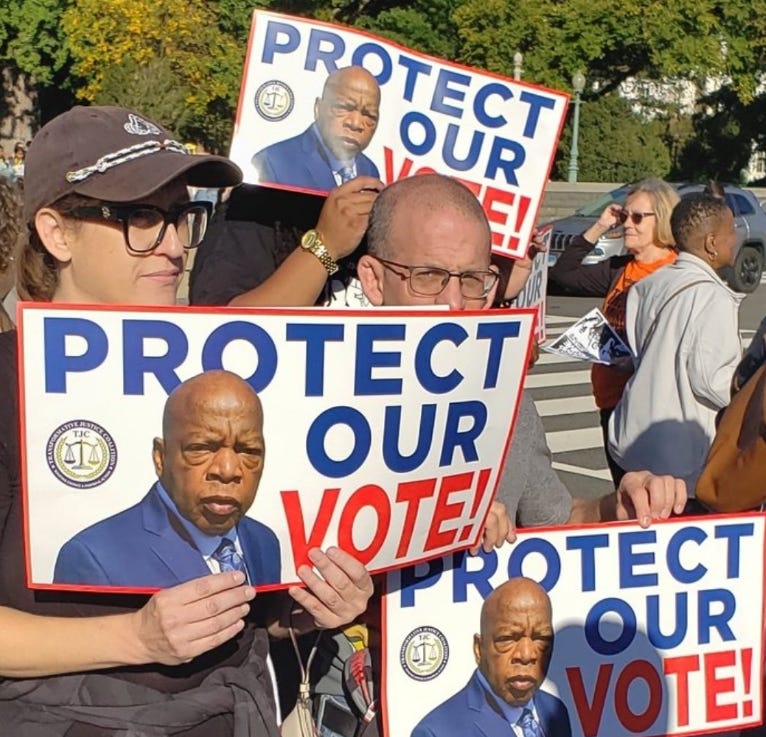 PLAZA. There were some lively demonstrations outside the Court yesterday, with many people holding signs bearing the photograph of the late Rep. John Lewis (D-GA). Lewis was badly beaten by police in Selma, Alabama in 1965, sparking a furor which helped push Congress to approve the Voting Rights Act.